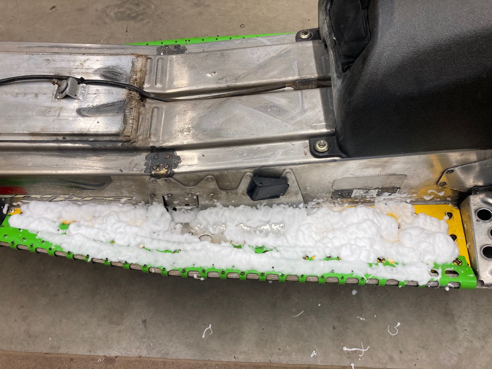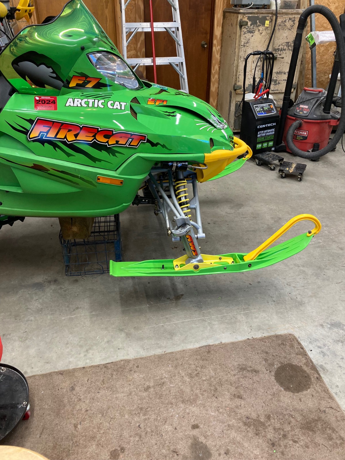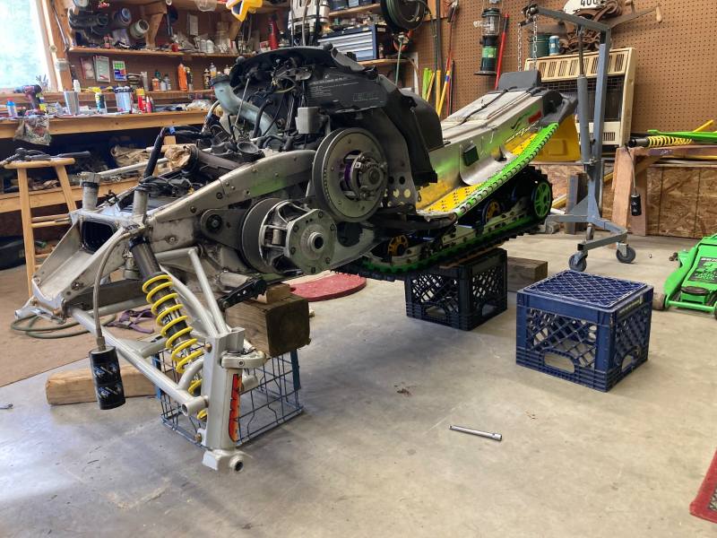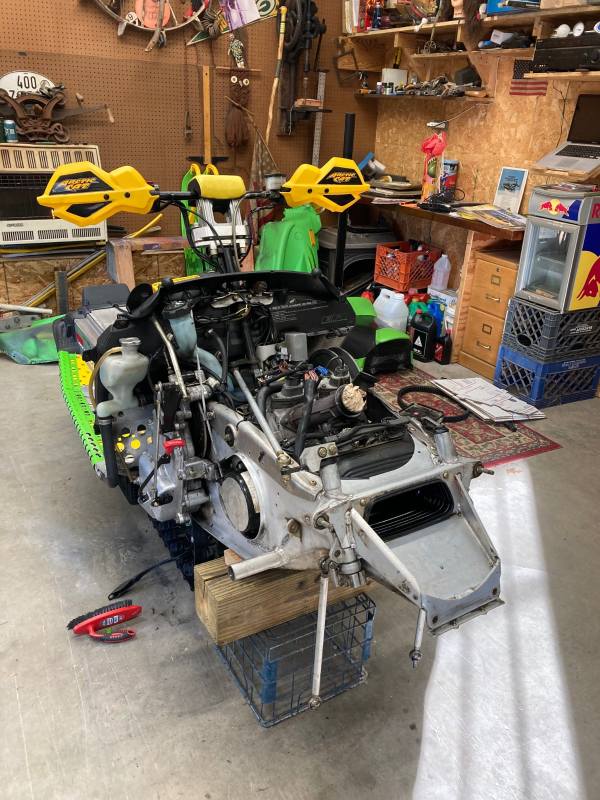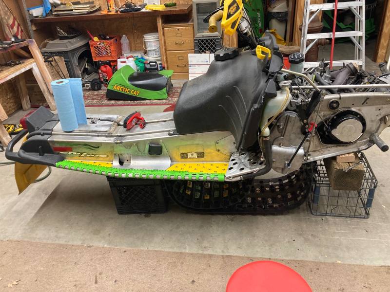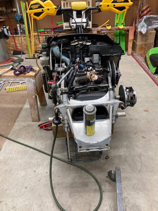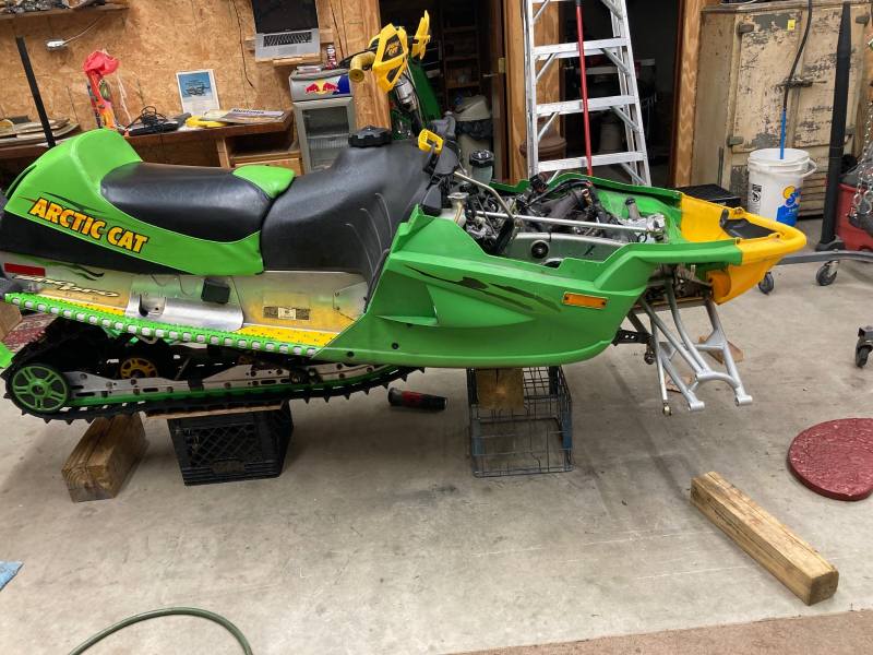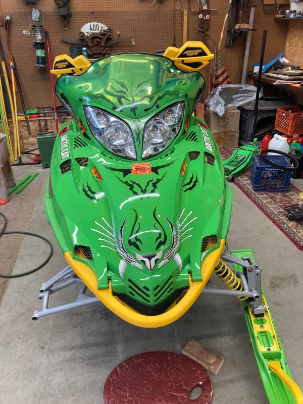 2004 F7R Sno Pro, Green Tiger Edition. Bought new and after 12,000 miles figured it was time for a refresh. Complete skid rebuild, all shocks rebuilt, new speedo side driveshaft bearing. All front suspension components powdercoated. Five cans of foaming engine brite and a ton of scrubbing. Happy with the result and the thing still flat out rips. Might just sell the 2018 ZR8 and run this old girl next year.