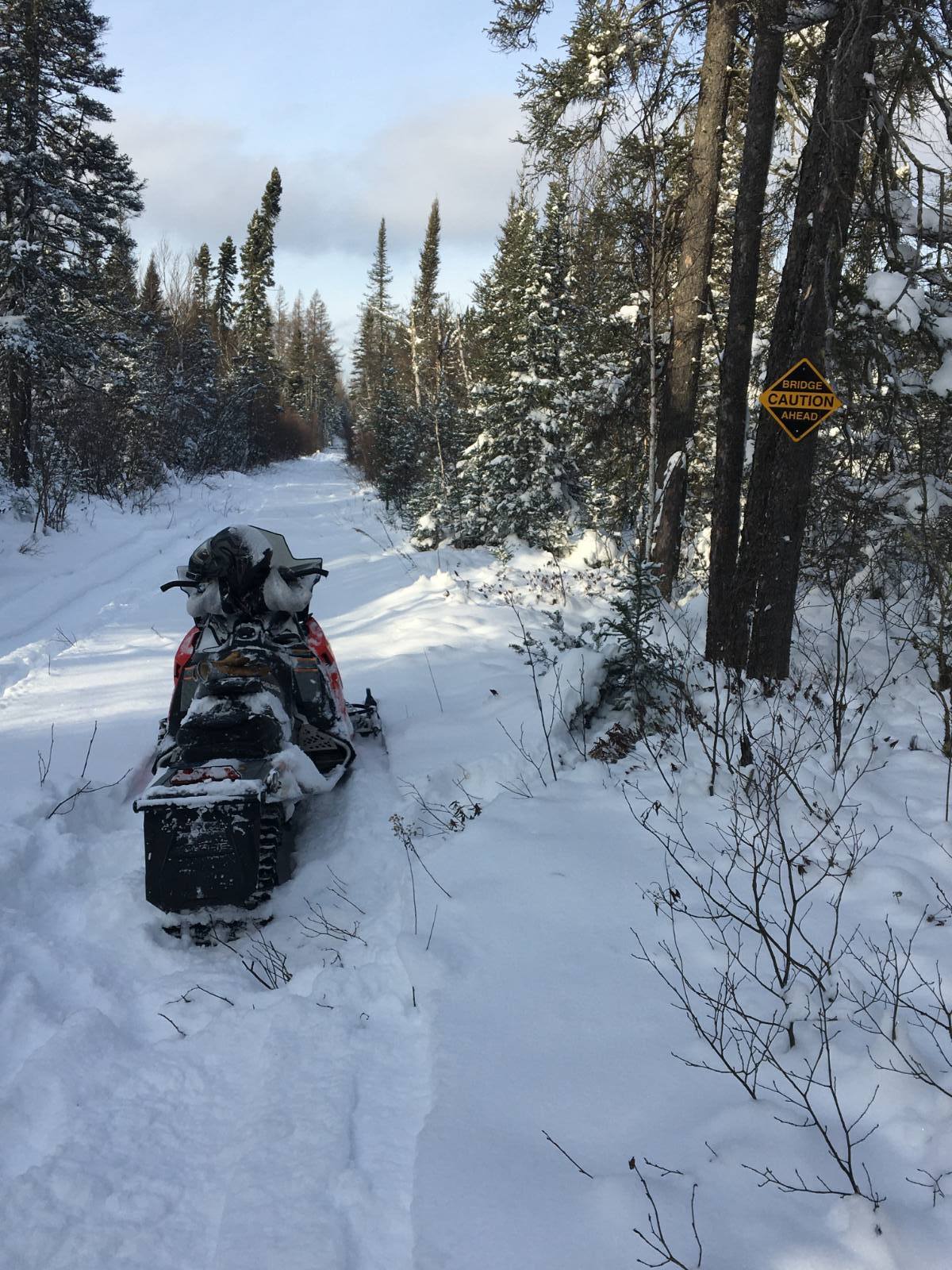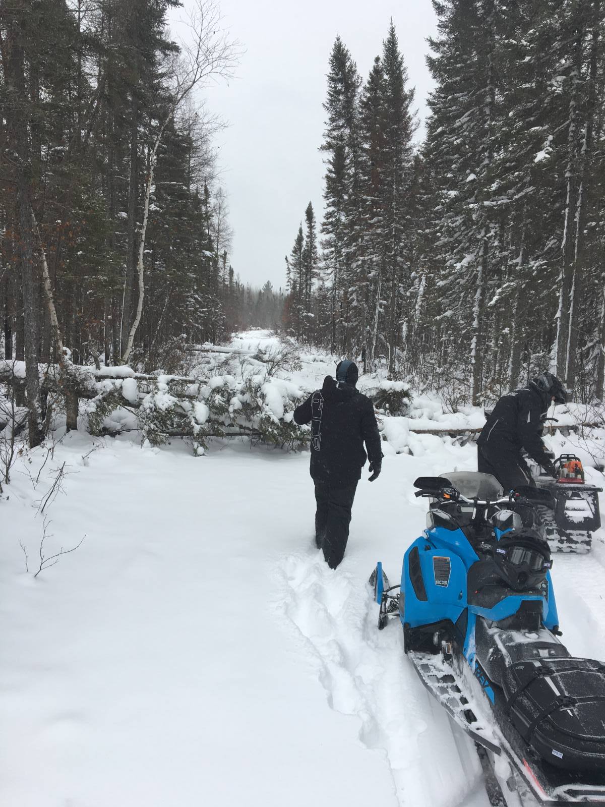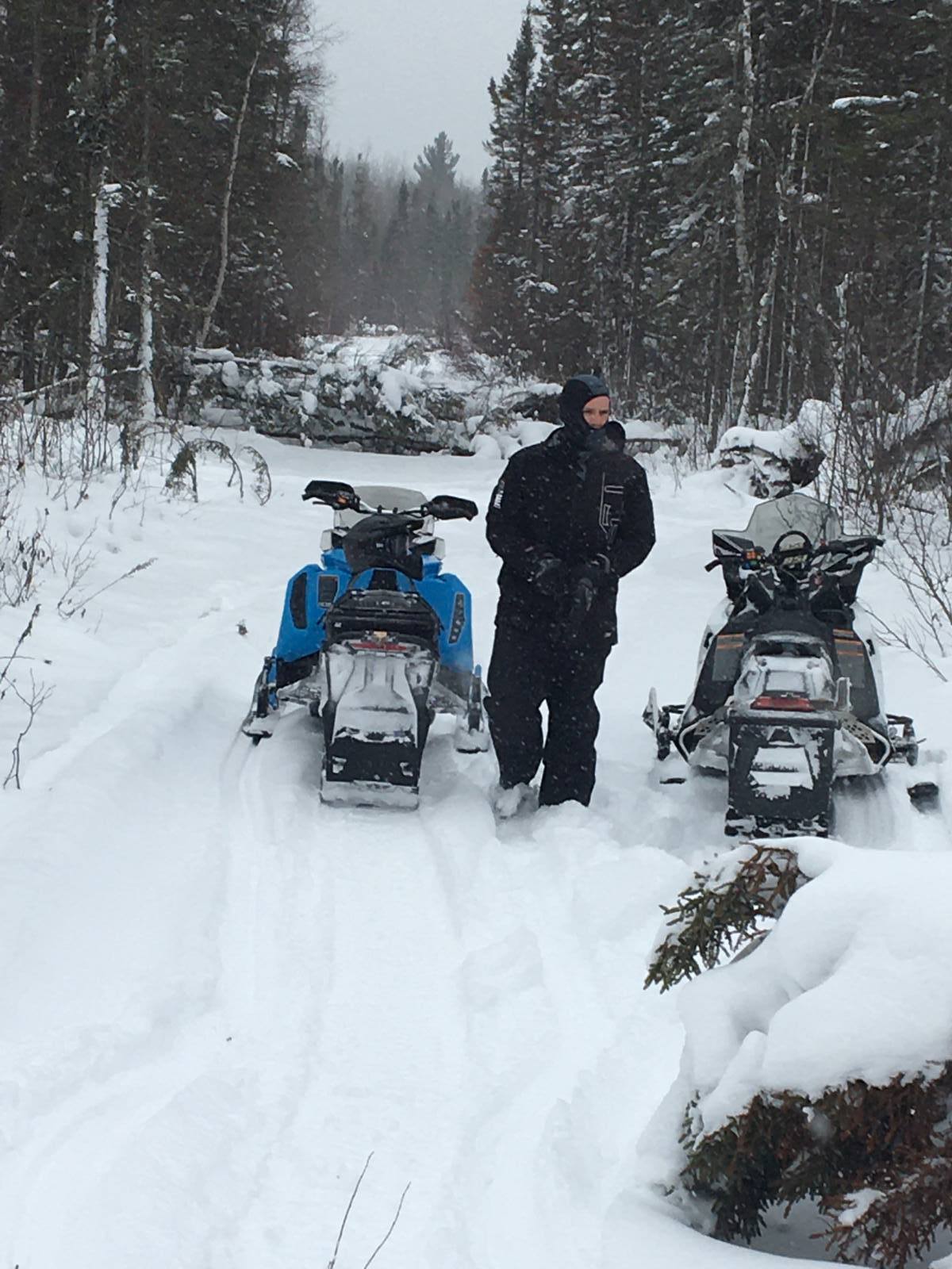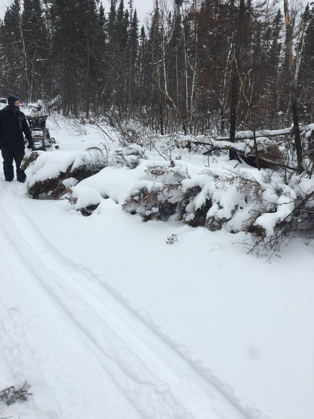 Trying to get the Yukon open for business as soon as we can. Still a huge mess where the Greenwood fire went through. There was a logging company that WAS supposed to clean it up for us being as he is logging in that area but he didn't so we have to do it the old fashion way. Two of us spent the whole day yesterday ( and 3 tanks or gas in the chainsaw ) cutting it all up so the groomer can push it out of the way. We are still trying to get it done before this weekend but with the cold temps. coming in, it probably not going to get done until next week. There are still a few spots in the swamps that are not frozen yet and no way to by pass them. With the cold temps this week, they should freeze up. Fingers crossed. Other club members are working on the southern part of the trail but last night a track broke on the groomer so they are doing a rescue mission today. 1.4 MB Views: 0