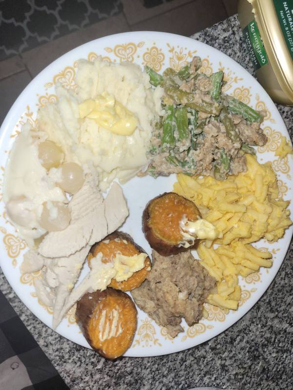 November 29, 2025Nov 29 Platinum Donating Member Probably like many others...Having leftovers.Mashed Potatoes, Sweet potato, the dreaded Green bean casserole, creamed onions, Macaroni and Cheese, stuffing and just a little Turkey. The SIL forgot to send me home Gravy.... can't eat much Turkey without it. Just wish the plate was bigger....will be digging into seconds.