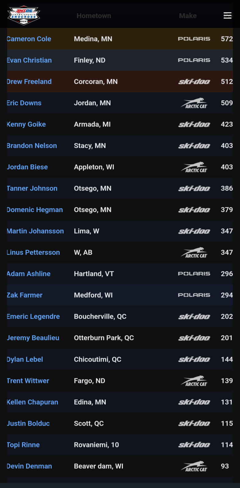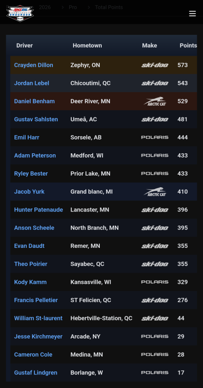 leading into the final night of the season... idk that Lebel can make up enough ground in two heats and a final to take the championship. if Benham does better in all three than Jordan he could potentially take second. Jordan seemed pretty pissed off about the lappers getting in the way at the podium last night... like, really pissed off. Night 2 at Dilute... last night of the season R1 H1 Patenaude / Yurk / Lebel H2 Dillon / Benham / Peterson R2 H1 Bester / Dillon / Patenaude H2 Peterson / Cole / Sahlsten Pro-Lite Final Ashline / Christian / Chapuran Pro Final Lebel / Dillon / Peterson Dillon claims the championship ๐ as a rookie. next year should be fun